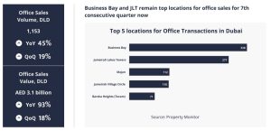 Business Bay led with 328 office transactions, followed by Jumeirah Lakes Towers (JLT) with 277 deals. Majan and Jumeirah Village Circle (JVC) recorded 112 and 110 transactions respectively, while Barsha Heights (Tecom) completed the top five with 71 deals.